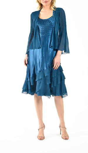 Dark Blue charmeuse dress accented with lace tiers along the hem with a matching pleated jacket.