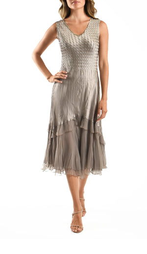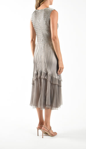 Luminous Oyster charmeuse dress paired with an embellished chiffon jacket.