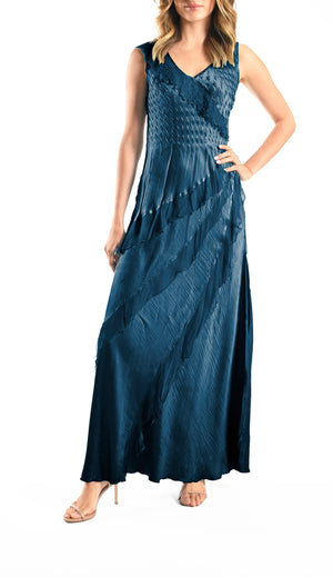 Navy maxi dress is accented with delicate chiffon ruffles and a textured hand pleating.
