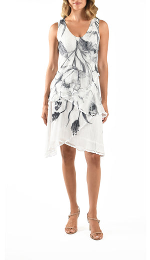 A-line dress is printed with lace floral. Flowing tiers of chiffon run along the bottom half of the sleeveless dress