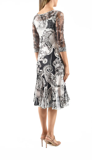 Finely pleated charmeuse dress with a Paisley design printed throughout .