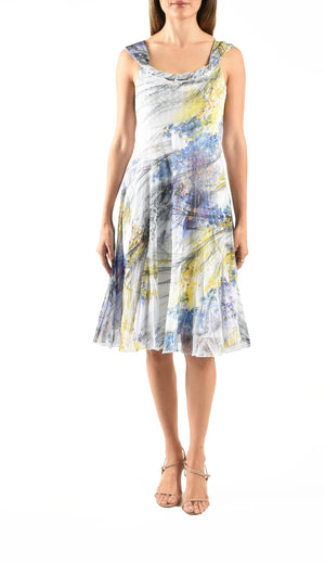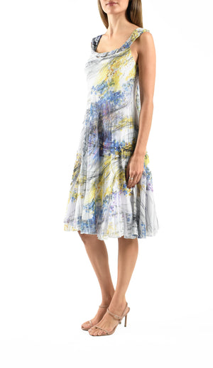 Chiffon dress with attached scarf. The hand pleating detailing creates an easy fit and wrinkle resistant quality.
