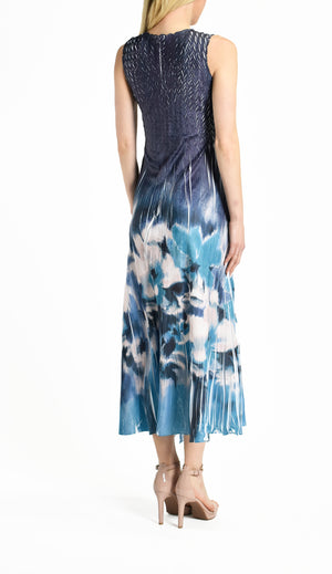 Shibori Border print dress features side ruffle detail with dimensional pleating and slits along the hemline, making the perfect warm weather look.