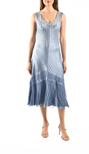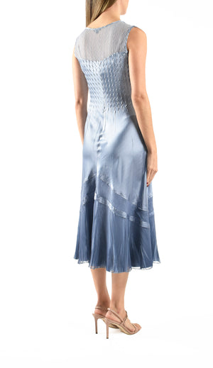 Persian Violet charmeuse dress paired with a ruffle front chiffon jacket.