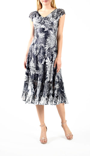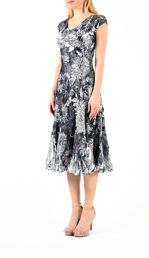 V neck charmeuse dress with Lace insets at shoulder and bottom