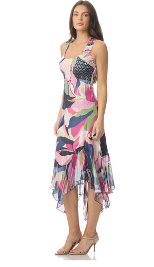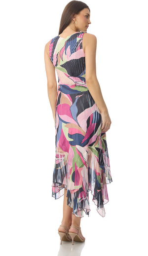 Scoop-neck Dress with asymmetrical hem. The hand pleating detailing creates an easy fit and wrinkle resistant quality.